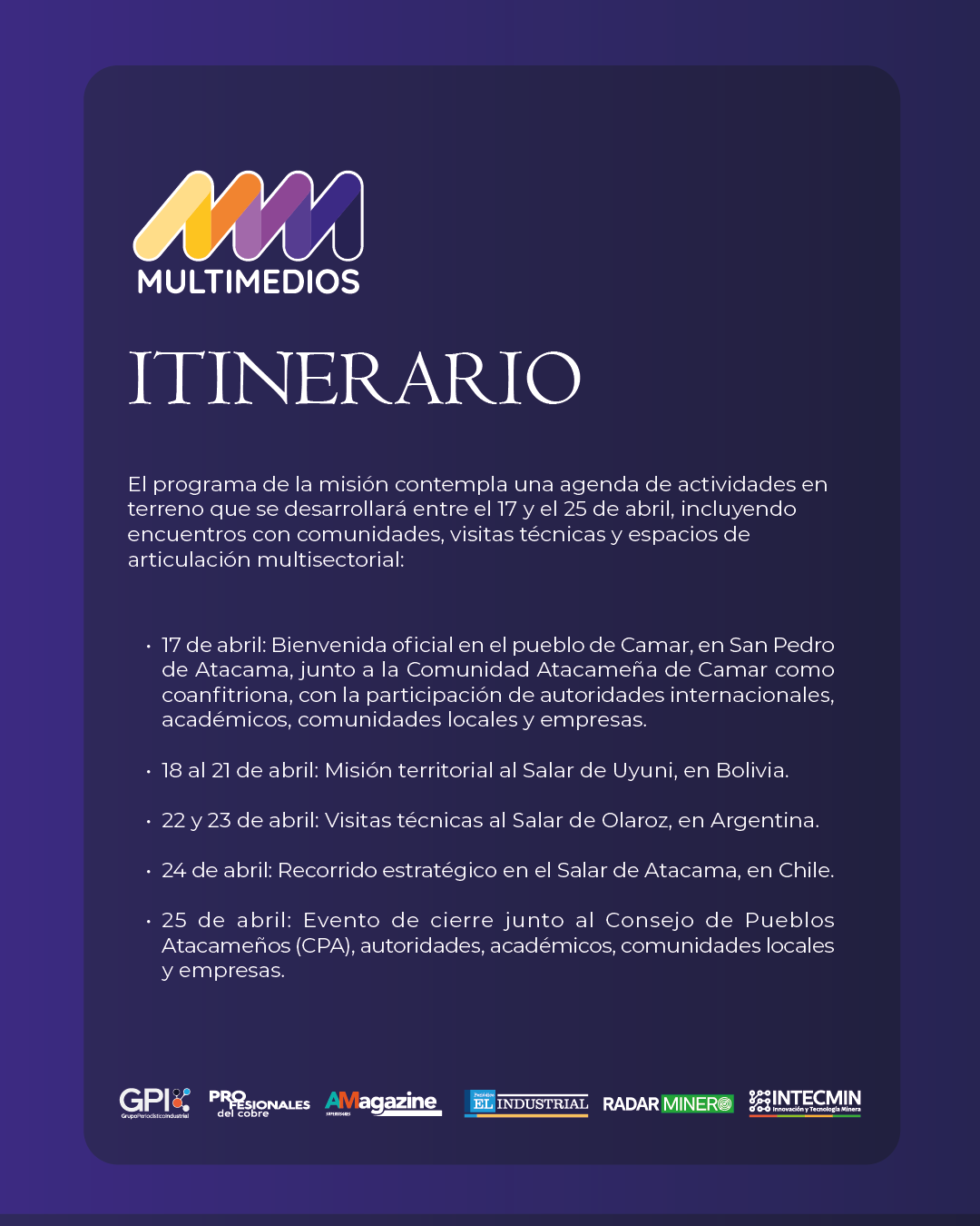 Entre el 16 y el 26 de abril, la iniciativa es liderada por la Asociación Cámara Internacional del Litio y Energías, CIL LITHIUM convocará a empresas, comunidades, académicos e inversionistas a una ruta por Atacama, Uyuni y Olaroz, con foco en articulación regional, sostenibilidad y estándares para el litio.
